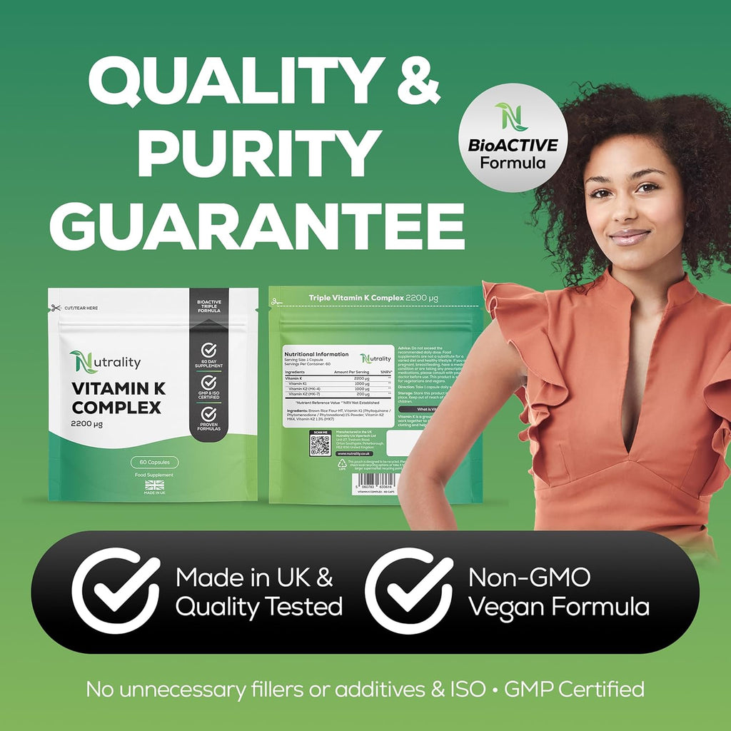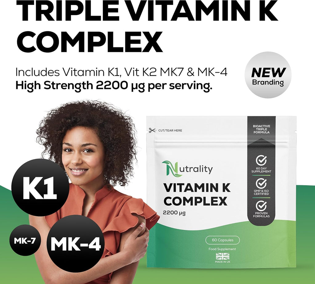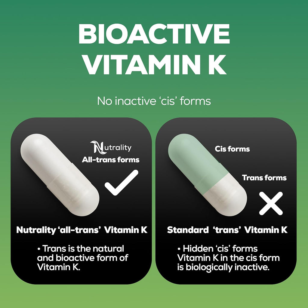 Nutrality Premium Triple Vitamin K Complex 2200 mcg – Bioactive Natural Forms – Vitamin K1 Plus Vitamin K2 (MK-4 & MK-7) – High Strength K2 Vitamin Supplements for Maintenance of Normal Bones